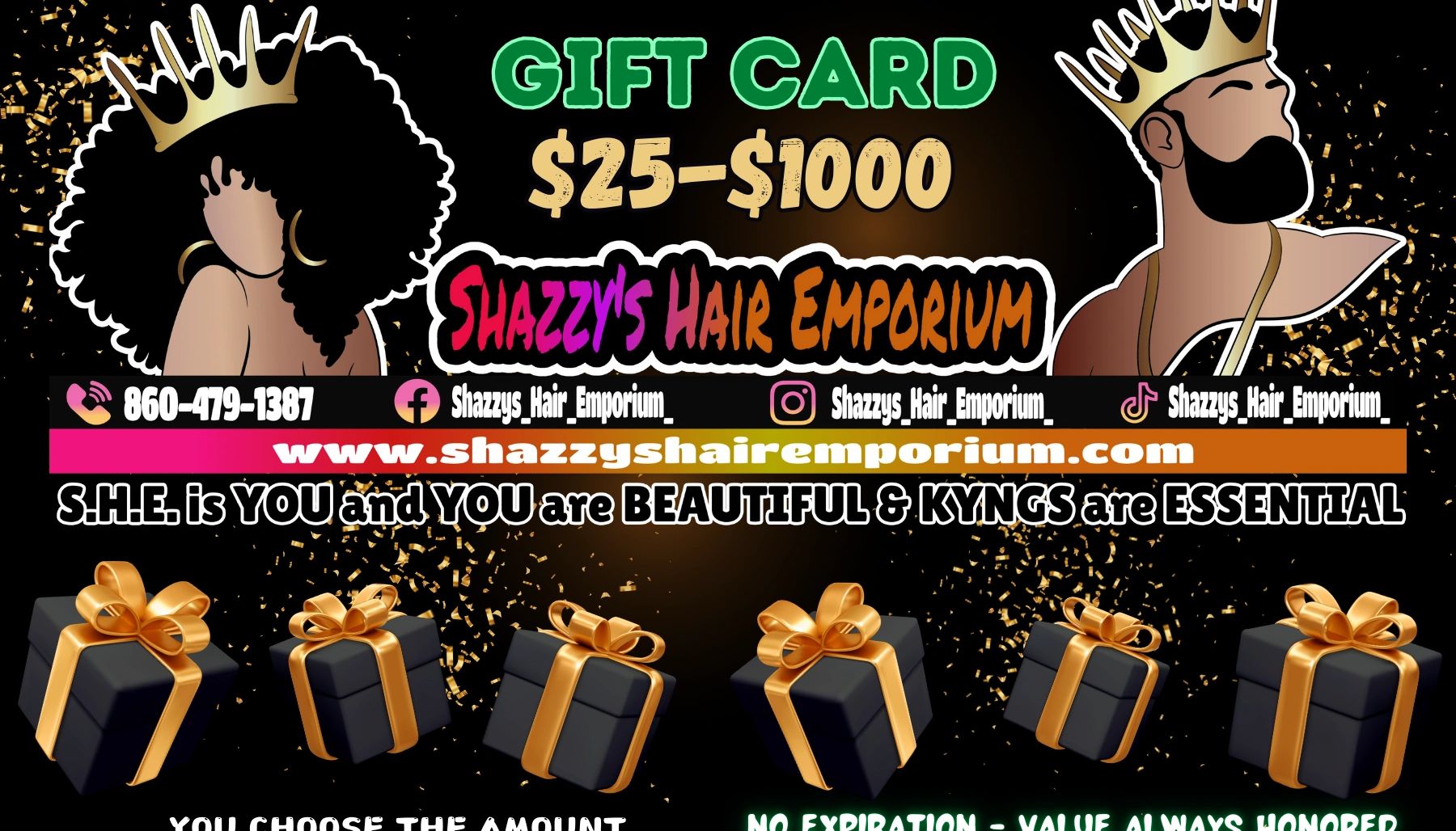 Treat yourself or your loved ones to the ultimate Shazzy's Hair Emporium - S.H.E. experience with our gift certificates. Available in any denomination starting at $25.00. Stock up TODAY!